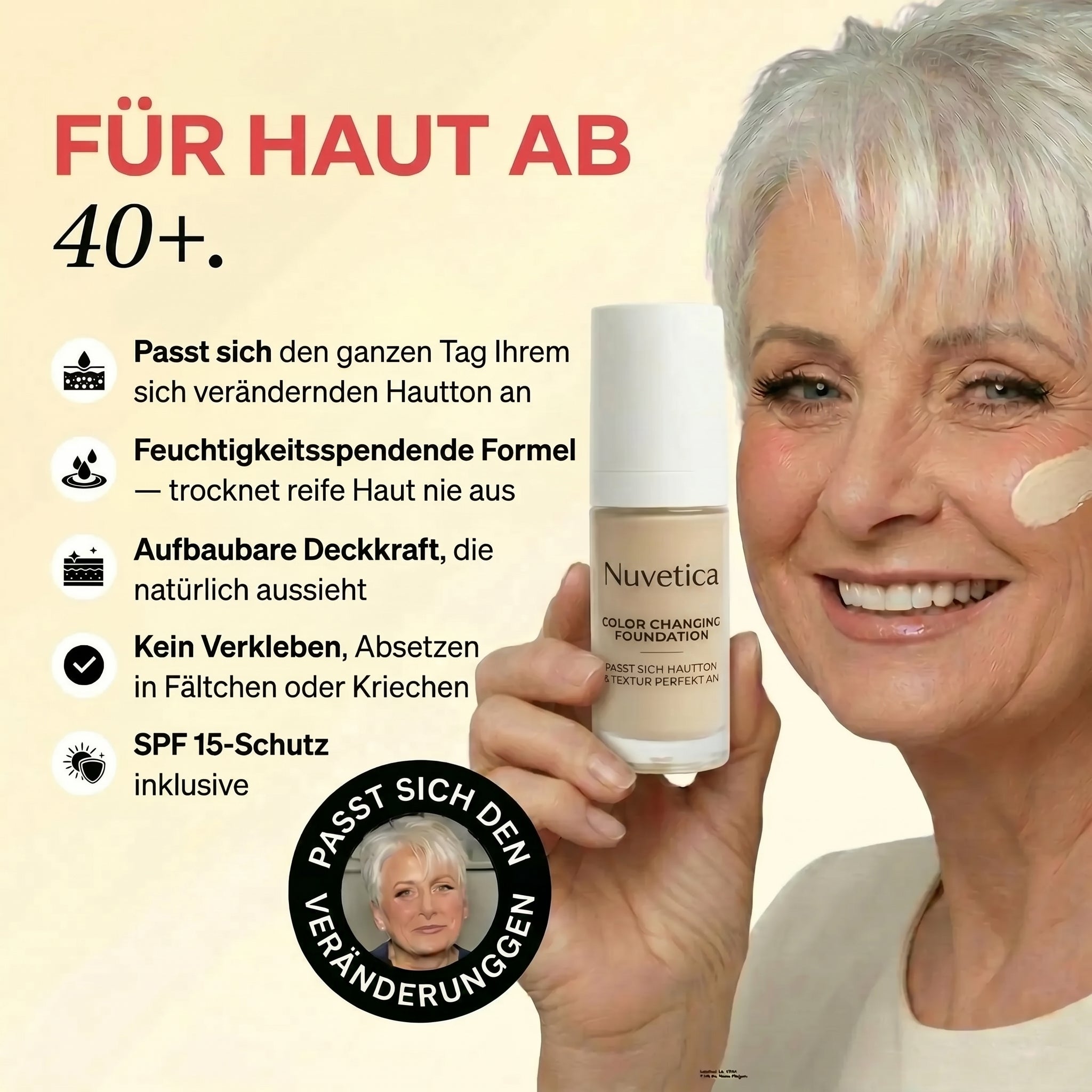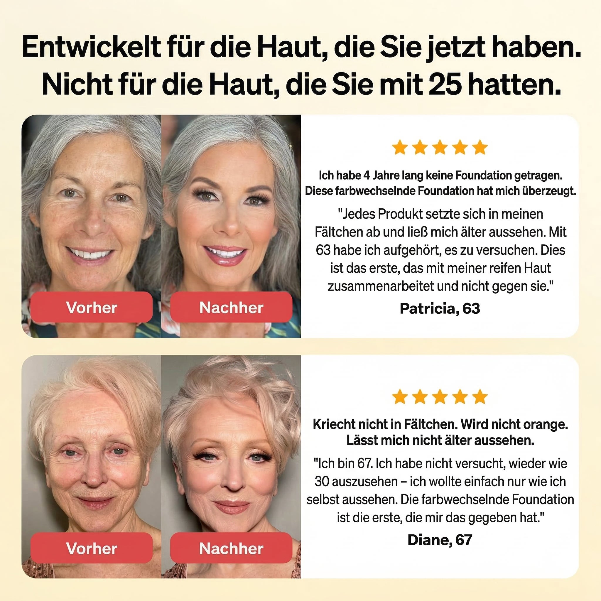 ✓ Reife Haut: Setzt sich nicht in Fältchen, trockenen Stellen oder feinen Linien ab. Gleitet sanft über Falten.