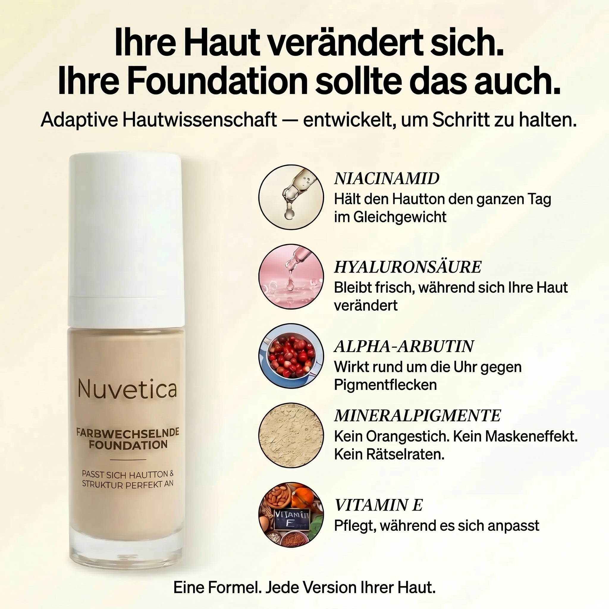 Andere farbwechselnde Foundations haben dich enttäuscht. Unsere ist anders – entwickelt mit sorgfältig ausgewählten, wissenschaftlich fundierten Inhaltsstoffen für sichtbare Ergebnisse.